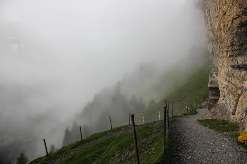 Bizim sansımıza/şanssızlığımıza o gün korkunç yağmur ve fırtına vardı. Hatta St. Gallen’e vardığımızda kesinlikle yukarı çıkan teleferiğin çalışmayacağını düşünüyordum. St. Gallen sonrası minik bir tren yolculuğu sonrası Wasserauen’a varıyorsunuz. Oradan da Ebenalpbahn’a biniyorsunuz. Bizden başka o havada deli olan 3 kişi daha vardı. Amacımız hava güzel olsaydı dağa tırmanmaktı ama maalesef mümkün olmadı. Teleferikten indiğimizde dağın tepesinde inanılmaz bir rüzgârla 15 dakika yürümek zorunda kaldık. Fakat geçtiğimiz yol bir rüya gibiydi. Sadece yeşillik... Bir mağaradan ve bir şapelden geçiyorsunuz. Sonra karşınıza dünyanın en güzel dağ evi çıkıyor: Aescher Wildkirchli Dağ Evi