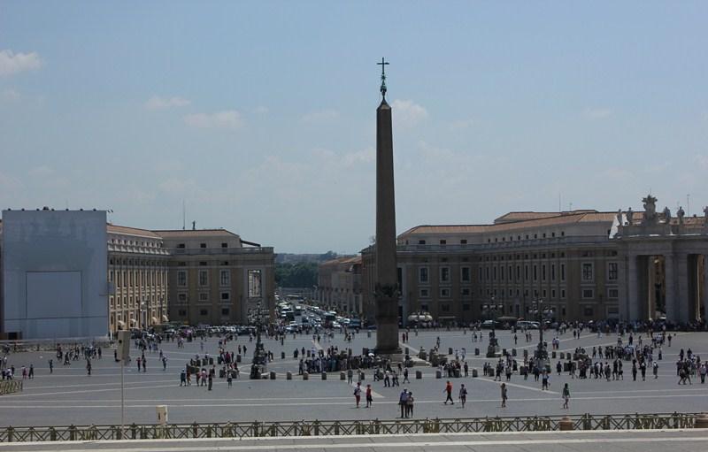 Neyse ki, geniş açıklık alanda, güneşin altında fazla dolanmadan, sıra hızlı ilerliyor ve kısa sürede meydanı çevreleyen yarım ay şeklindeki kolonatların altına giriyoruz. Kuyruğun sebebi; güvenlik ve kıyafet taraması yoksa giriş ücretsiz, serbest, ne de olsa Tanrı’nın evi.