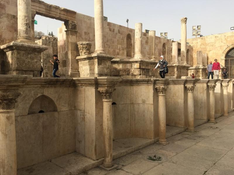 İstanbul gibi 7 tepe üzerine kurulmuş başkentteki bu tiyatrobu tepelerden El-Taj Tepesi’ne sırtını dayamış, 6.000 kişi kapasiteli, devasa boyutta. Üç kademeli tiyatronun birçok sütunu yıpranmış olsa da oldukça iyi korunmuş.