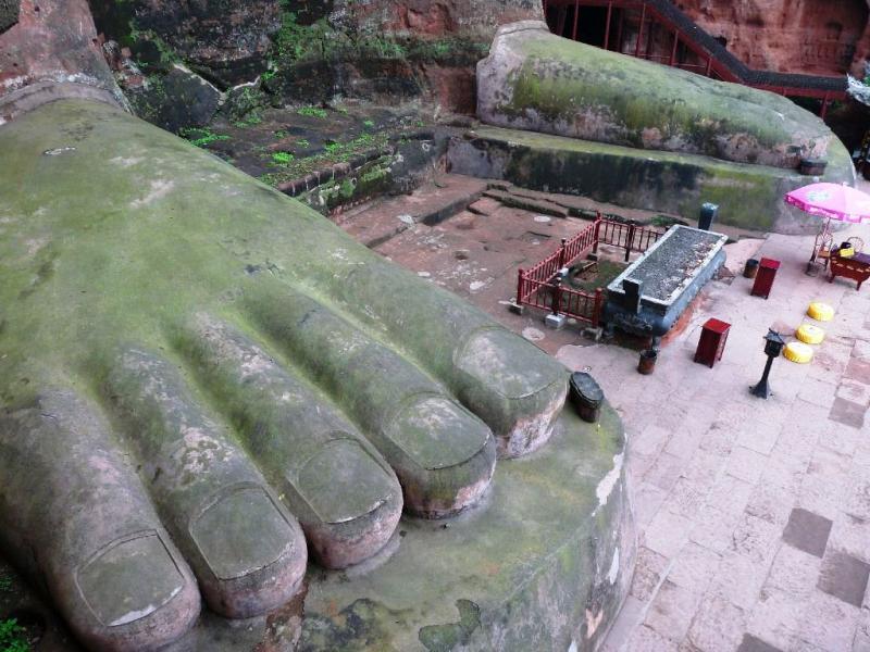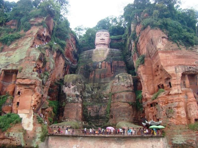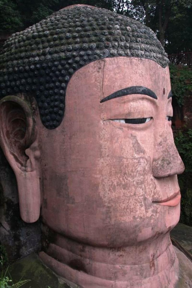 LESHAN UNESCO Dünya Mirası Listesi’ndeki Sichuan eyaletinin Leshan şehri yakınlarında Minjiang, Dadu and Qingyi nehirleri kenarında bir kayanın içine oyulmuş Dev Buddha’yı görmek için otobüsle 2-3 saat yol alıyoruz. Sonra bu dünyanın en büyük ve 71 metre ile dünyanın en uzun pre-modern heykeli olan Buddha heykelini nehirden seyretmek üzere tekneye biniyoruz. Tabii hepimiz can yeleklerimizi giydikten sonra hareket ediyoruz.