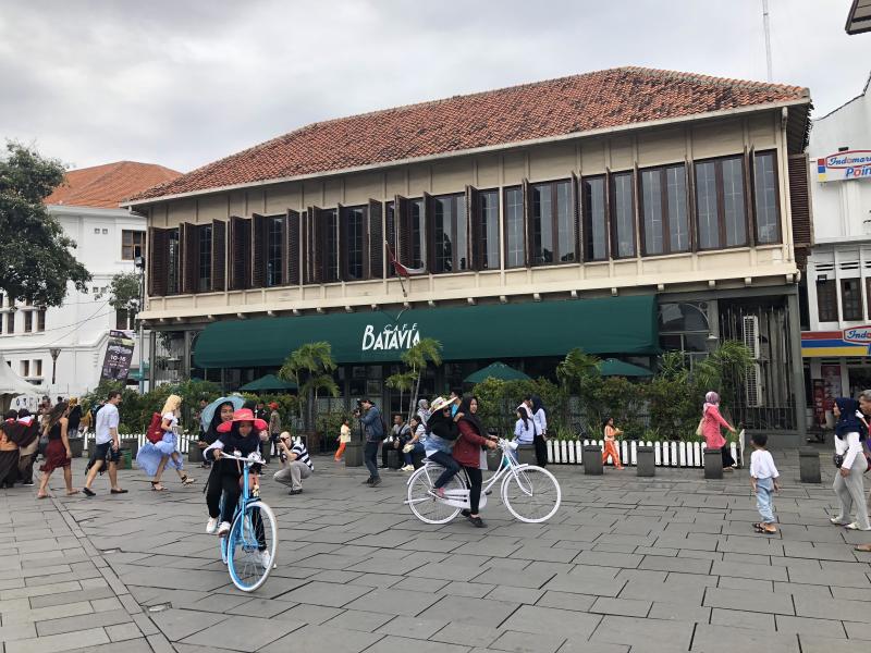 Bir sonraki durağımız Jakarta Eski Kent Meydanı. Bu meydan o kadar renkliydi ki... Küçük büyük demeden herkes meydanda kiraladığı mavi, beyaz, pembe bisikletlerle bisiklete uyumlu şapkalarla tur atıyordu. Biz de eksik kalmadık tabii.