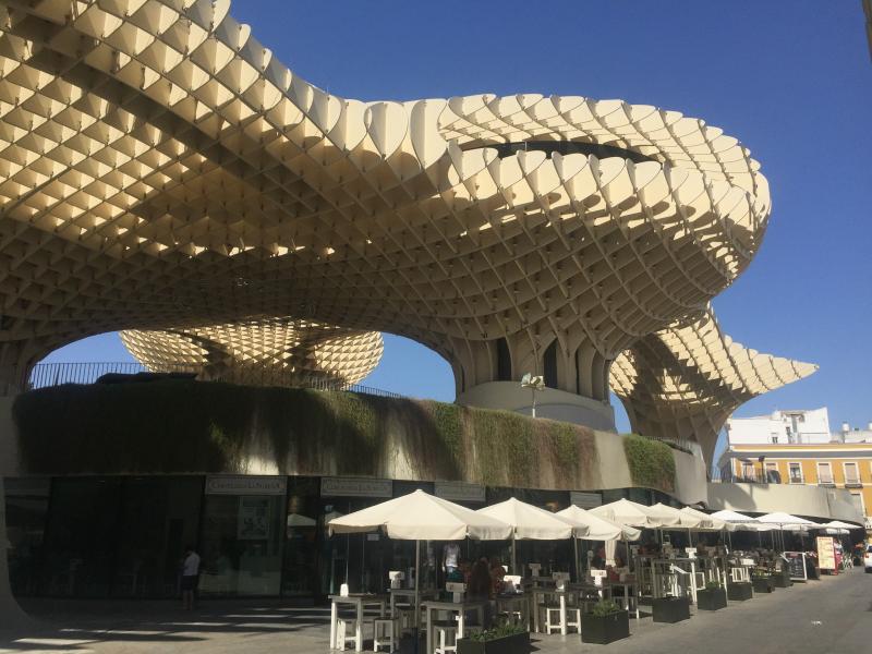 Yol üstünde diye gezimize dünyanın en büyük ahşap yapısı ile başladık. Çatısı dalgalanan şemsiye biçiminde olan bu yapı öncelikle otopark olarak düşünülmüş, fakat kazı çalışmalarında ortaya çıkan arkeolojik bulgular buranın açık hava müzesi ve kentsel bir merkeze dönüşmesini sağlamış. Şu anda ise burası daha çok toplanma alanı, protestolar vs. için kullanılıyor. Sevilla'nın dokusuna ters olsa da, halk bu yapıyı benimsemiş görünüyor.