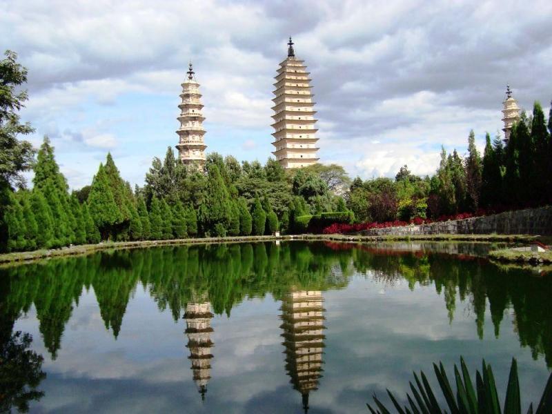 Da Li kentinde Ming Hanedanlığını tarafından inşa edilmiş sakin, sessiz, geleneksel Çin evlerinin bulunduğu bir “eski şehir” bir de “yeni şehir” var. Çok uzaktan siluet olarak görünen, eski Çin Budist mimarisi tarzında inşa edilmiş olan “Üç Pagodalar”ın oldukça elegan bir görüntüsü var. Tuğladan yapılmış ve üzeri beyaz çamurla sıvanmış ve bir üçgen oluşturan 3 binanın biri 69, diğerleri ise 42 metre civarında. Yemyeşil bahçesi, gölet, renk renk çiçeklerle adeta cennetten bir köşe olan 3 Pagodalar; arkasında bulunan gölde muhteşem bir görüntü oluşturarak bizlere çok güzel görüntüler veriyor.
