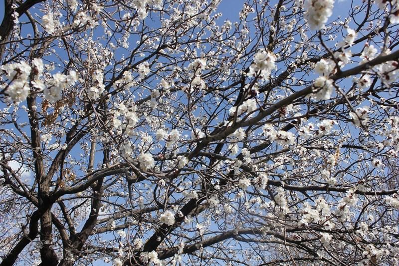 Kayısı ağaçları, şehir yerleşiminden daha geniş bir alanda göz alabildiğine yayılıyorlar. Yapraksız, sadece çiçeklerle bezeli ağaçlar, bozkıra ince bir sis çökmüş görüntüsü vermişler. Beyaz kayısı çiçeklerinin diplerindeki belli belirsiz pembelik ise bu sisi, akşam güneşinin kızıl renkli son ışıkları yansımış gibi boyamış.
