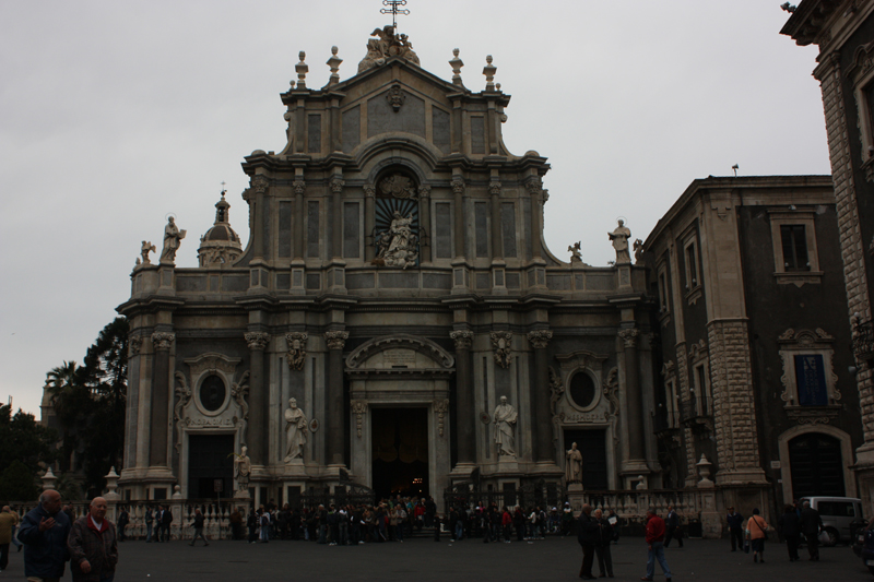 Catania’daki kiliselerin çoğu Santa Agatha’ya adanmıştır. Anlatılana göre Agahta 3. yüzyılda Hristiyanlığı ilk kabul edenlerdenmiş. Hristiyanlığı seçtiği ve yaymaya çalıştığı için pek çok işkenceye maruz kalmış, ama hristiyanlıktan dönmemiş. Daha sonra ateşe atılmış ve yakılmış. Tam bu sırada depremin olması, Agatha’yı azize mertebesine yükseltmiş. Biz de ilk olarak Agatha’ya adanmış olan Catania’nın en büyük katedrali Doume Katedraline giriyoruz. Doume Katedrali, Piazza Republica denilen büyük bir meydanda yer alıyor. Etrafta çok güzel ve görkemli binalar mevcut. Her yer heykeller ile dolu ancak heykellerin pek çoğunun başı yok.