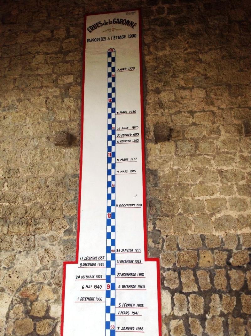 Bu kale kapısı içindeki duvarda Garonne Nehri’nin yıllar içinde ne kadar yükseldiğini gösteren bir cetvel var.