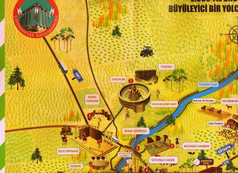 Kentte dünyanın en iyi korunmuş Zeus tapınağı, dünyanın ilk örneklerinden stadyum-tiyatro kompleksi, dünyanın ilk borsa yapısı vardır. Bu borsa yapısı 1970 Gediz Depremi’nde caminin yıkılmasıyla ortaya çıkmıştır. Bunun dışında nekropoller, olimpiyat şeref tribün abidesi, 4 köprü de vardır ki bunların çok kötü şekilde restore edilmiş ikisi hala kullanılmaktadır.
