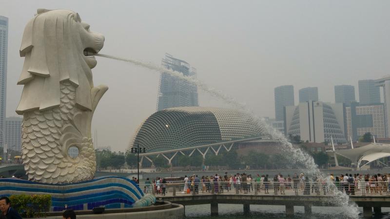Bu bölgede turistlerin uğrak yerlerinin başında Merlion geliyor. Yarı aslan, yarı balık figürü bir çeşme, Singapurlular için önemli bir yapıtmış, ancak pek bir estetik bulduğumu söyleyemeyeceğim. Ancak ilginçtir turistlerden en çok rağbet gören alan da burası. Herkes özçekim sırasında.