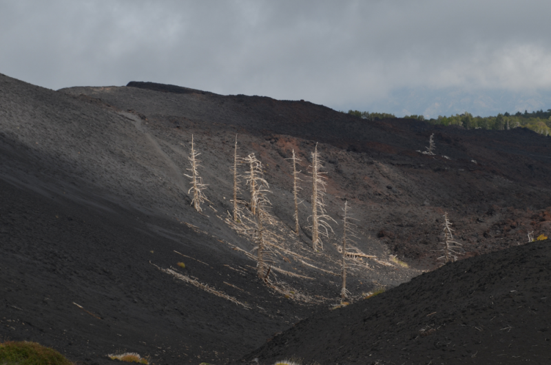 Biraz daha ilerledikten sonra aracımızın gelebileceği en yüksek yere ulaşıyoruz. Buradan sonrasını yürüyerek devam edeceğiz. Yukarılara doğru çıktıkça yanardağların ne kadar yıkıcı birer doğal güç olduğunu görüyoruz. Bir yanda tamamen yıkılmış ve artık soğumuş lavların üstünü örttüğü yapılar diğer yanda ayakta kalmış ancak artık çıplak birer odun haline gelmiş ağaçlar görüyoruz. Özellikle bazı alanlar insana farklı bir gezegendeymiş hissi veriyor.