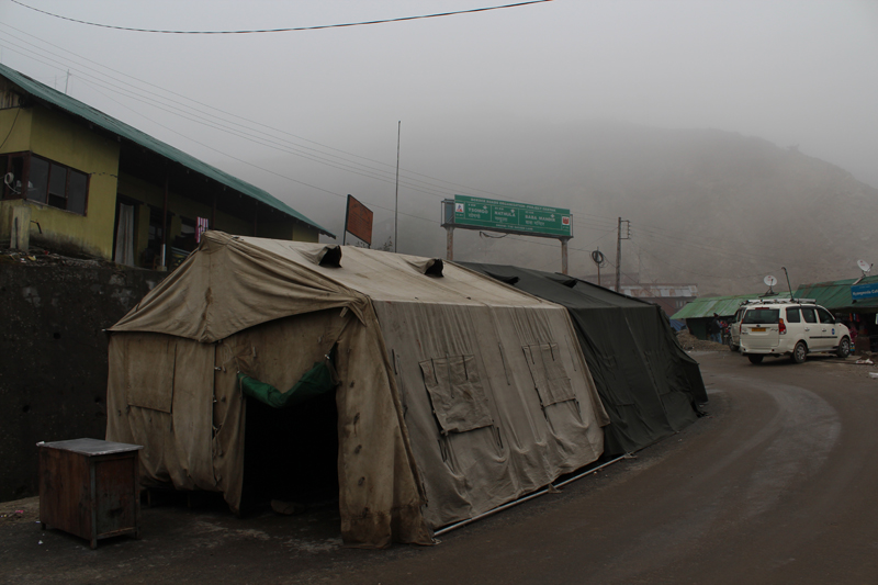 18 Eylül 2011’de Sıkkım’ın kuzeyinde meydana gelen 6,5 büyüklüğünde depremden en fazla etkilenen bölgelerden biri de Tsomgo gölü çevresiymiş. Bu nedenle yollar da bu depremden büyük hasar görmüş. Ancak biz şanslıydık ki deprem neticesi oluşan heyelan nedeni ile kapanan yol, 5 gün önce açılmış. Giderken yol üzerinde hasarlı ve çökmüş binaları üzülerek görüyoruz. Depremin üzerinden 40 gün geçmiş olmasına rağmen, halâ insanlar 2-3 derece sıcaklıkta derme çatma çadırlarda kalıyorlar.