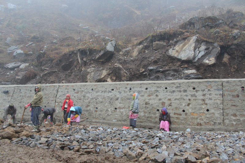Tsomgo gölüne giden yol çok dar ve virajlı. Üstelik zaten bozuk olan yol depremin etkisi ile daha da bozulmuş. Yolda arka arkaya giden araçlardan biri çamura saplanınca diğerleri de bu aracı beklemek durumunda kalıyor. Çünkü bir tarafı dağ, bir tarafı uçurum olan bu yol sadece tek şeritli. Üstelik uçuruma uçmayı engelleyebilecek bir bariyer de yok.