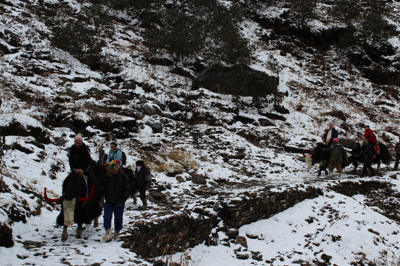 Gölün etrafındaki bir kilometrelik taşlı ve karlı yollardan, muhteşem göl manzarası eşliğinde ağır ağır ilerleyerek turumuzu bitirdik. Ancak safarinin son etabında adrenalin tavan yaptı. Zira önümüzdeki yol bitti, yaklaşık 40 – 50 metre uzunluğunda dik basamaklar başladı. Tibet öküzünün sahibi merdivenleri inerken öne düşmemek için sırtımızı geriye almamızı söyledi. Bu çok heyecanlı bir deneyim oldu. Göl kenarında muhteşem manzaralı fotoğraflarımızı çektik. Çok ilginçtir ki, fotoğraflarımızı çekerken 5-10 saniye içinde tamamen sis tüm manzarayı kapattı.