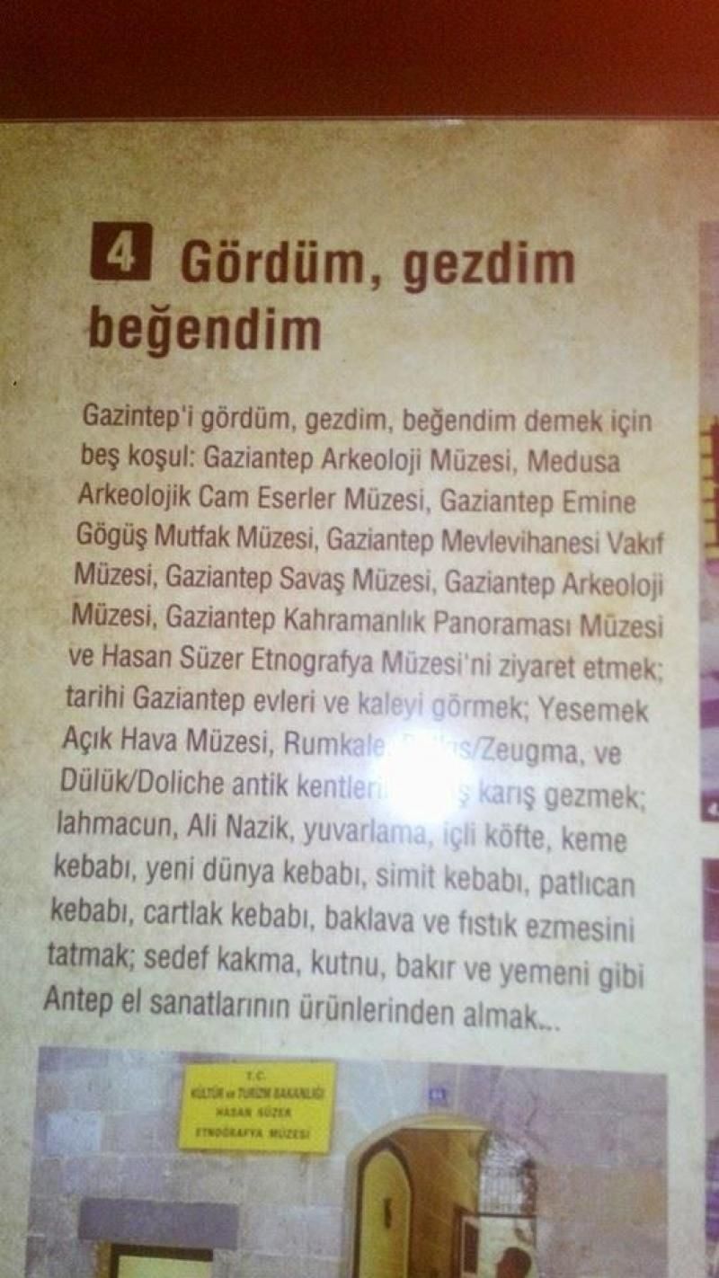 1. Dünya Savaşı'nın sonunda İngiliz ve Fransız işgaline uğrayan kent 11 ay işgale direnmiş ve Şahin Bey'in Antep köprüsü üzerinde direnip kente düşman askerini sokmaması ve Karayılan gibi kahramanlarla bu şehir kendini düşmana karşı korumuş ve Gazi unvanının almış. İpek Yolu üzerinde bulunan bu şehir hep mistik havası, yemekleri, kahramanlıkları ile gezilmesi gereken bir şehir olarak günümüze gelmiş, benim için de en önemlisi dedelerimin yaşadığı topraklar olması... Bu geziyle bilmediğim tarihi özelliklerini de öğrendim. Şehit Kamil diye bir semt vardı. Bu ismin Fransız askerlerinin annesinin peçesini açmasını istemesiyle, annesine göğüs geren küçük Kamil'in şehir edildiği bölge olmasından dolayı verildiğini öğrendim mesela. Karayılan ve Şahin Bey'in Antep harbinde ne kadar kahramanlık göstererek bu şehri kazanmasını ve Atatürk'ün de "Ben bu Antep halkının gözlerinden nasıl öpmeyeyim" dediğini ve nüfus cüzdanında Atatürk'ün doğum yeri "Antep" yazdığını biliyor muydunuz? Daha önceleri bilmiyorum ama bu şehir gerçekten çok milliyetçi bir şehir.