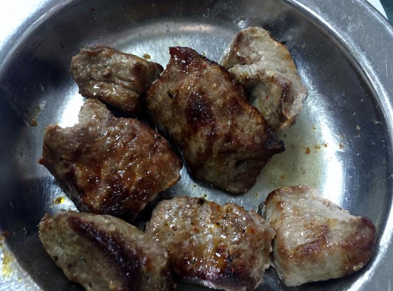 Garsona acısı az olsun demiştik ya, hata etmişiz. Antep'te acısı az demek bizim anladığımız anlamda normal acılı oluyor, çünkü onlar full acılı yiyorlar. Acısı az demek için hiç acısız demek gerekiyormuş çünkü hiç acısız deseniz bile koyuyorlar (?) Ağzımız, midemiz, her yerimiz yana yana kebapları yiyoruz. Karışık kebap güzel ama asıl güzel olan küşleme. Eğer Halil Usta'ya giderseniz küşleme yemenizi öneriyorum, bize bir porsiyon yetmedi ikinci porsiyonu da paylaştık.