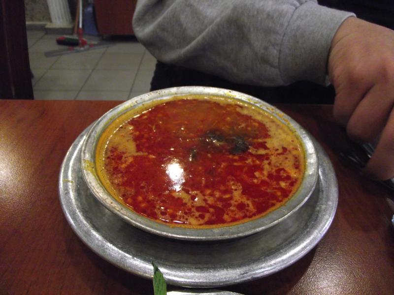 Beyran'ın Antep'e özgü ve sadece sabah çok erken saatte yenilebilen işkembe türü bir çeşit çorba olduğunu söylemiştik. Biz de usulüne uygun olsun diye sabah saat 6.00 gibi çıkıyoruz ve etrafta Beyran satan bir yer arıyoruz, bize "Kelebek" adında bir mekan tarif ediyorlar, gidiyoruz. Ben tezgahta beyranın hazırlanışını görünce zaten direkt vazgeçiyorum. Bir masaya oturuyoruz, Sadık'ın Beyran çorbası geliyor, bana da bir mercimek :) Sadık'ın yorum olumlu, beğenmiş.