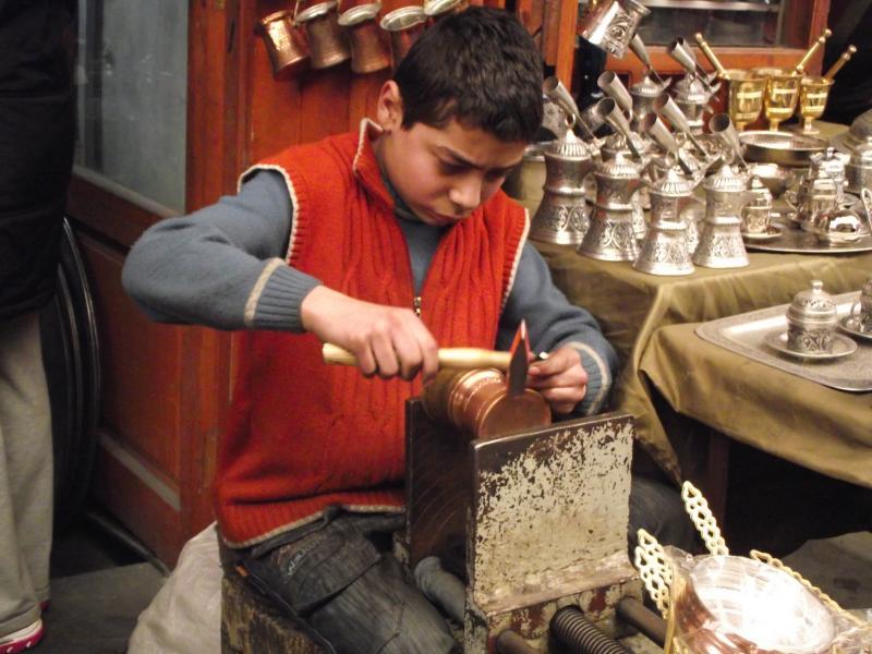 Gaziantep merkezi çok büyük bir alanı kaplamıyor, her yere yürüyerek gidebilirsiniz. Zincirli Bedesteni'nden çıktıktan sonra etrafa bir bakalım dedik, dar bir sokaktan geçerken dükkânların önünde bakır tezgahlarında bakır döven çocuklara rastlıyoruz. Burası Antep'teki bakır piyasasının merkeziymiş.