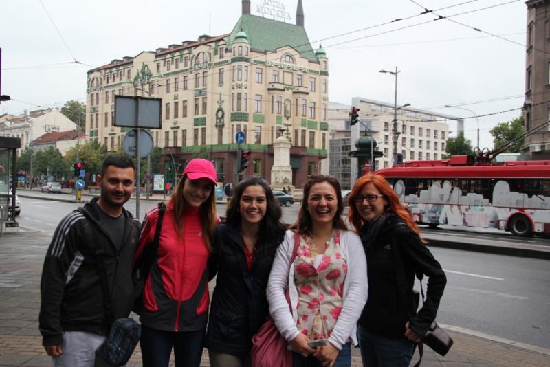 Fakültelerin arasında kalan öğrenci parkını geçtikten sonra meşhur caddesi (bizdeki İstiklal Caddesi gibi) Knez Mihailova'dan yukarı doğru çıkıp bir tatlı sarışın arkadaştan müzenin tarifini aldık. Tatlı diyorum çünkü arada bir şeyi yanlış söyledi ve sonra 'sorry, I am blonde' dedi :) Biz demedik kendisi dedi bakın. Müzeye doğru giderken bloglarda gördüğüm Hotel Moskova'nın önünde bizler de fotoğraf çektirdik hemen. Bu otel şehrin en lüks oteli imiş. Şehre gelen ünlü aktörler, tiyatro sanatçıları bu otelde kalıyorlarmış.