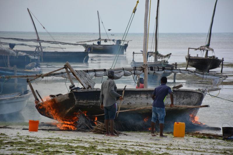 Sahil boyunca fotoğraflarımızı çeke çeke Nungwi köy merkezine doğru gidiyoruz. Deniz fenerinin hemen arkasındaki bölge bir liman ve şu an deniz çekilmiş olduğu için bir çok tekne sahibi teknelerini temizliyor ya da onarıyor. Buraların en önemli geçim kaynağı turizm ve tabii ki balıkçılık. O nedenle de her ikisi için de teknelerin çalışabilir olması çok kritik. Hemen köyün kıyısında bir balık pazarı bulunuyor ve sabah erken saatlerde burada balık mezadı yapılıyor. Ancak ne yazık ki o kadar erken saatlerde okyanus hiç çekilmiş olmadığı için gitmemiz mümkün olmadı. Köye karadan da ulaşabiliyorsunuz ancak o yol çok daha uzak, o nedenle biz tercih etmedik.