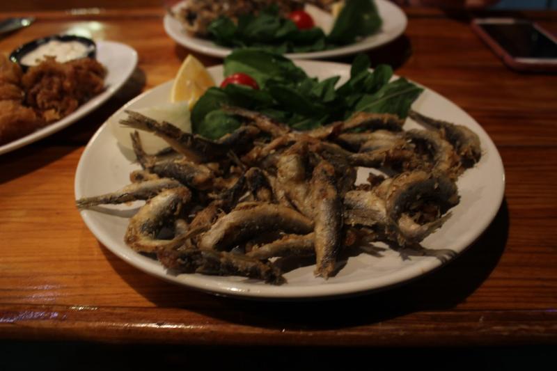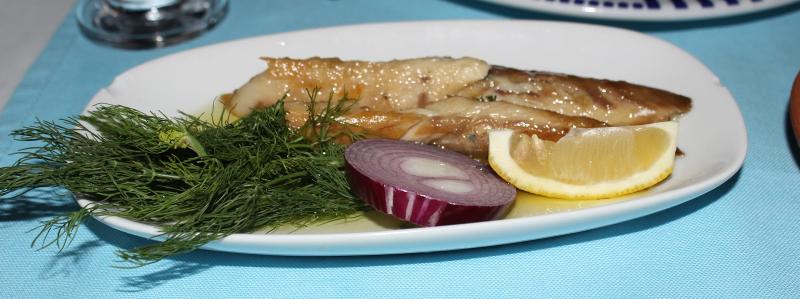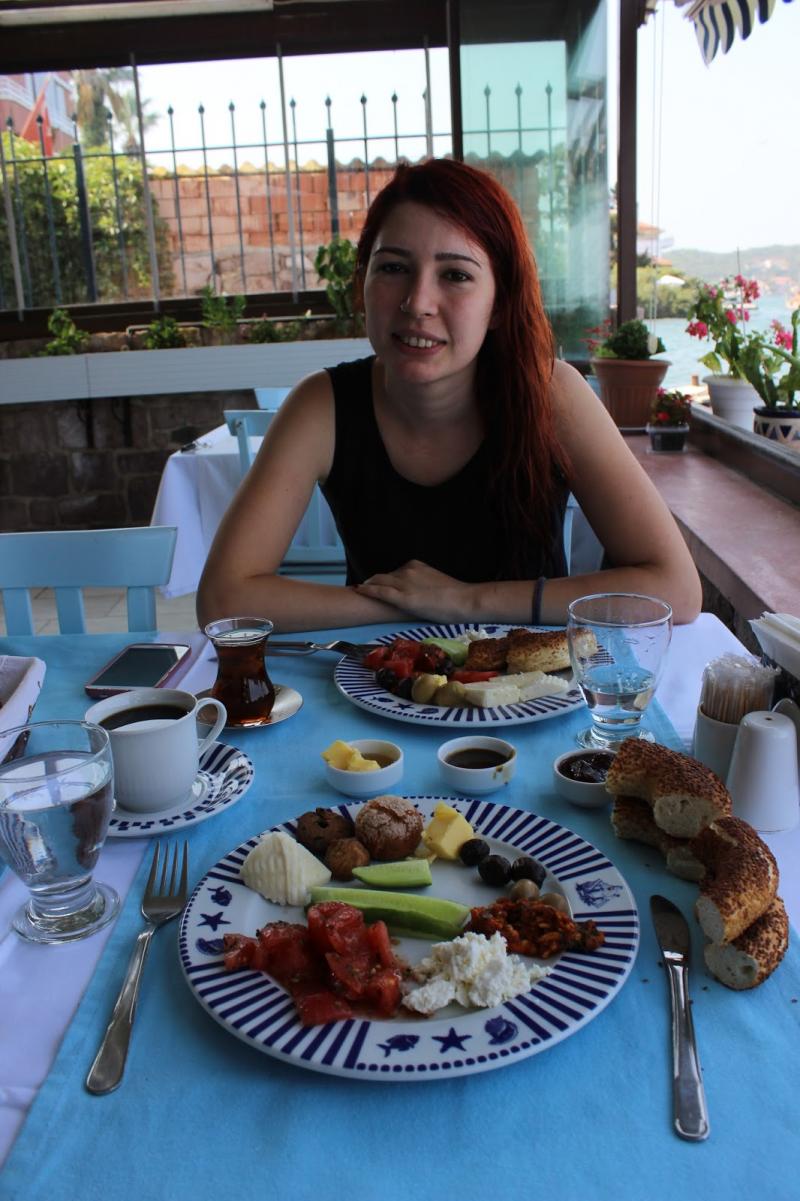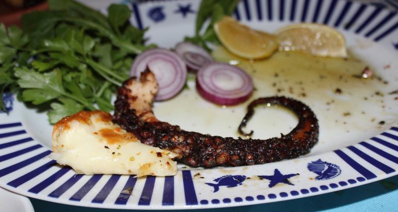 İlk günün yorgunluğuyla otelimize geri döndük ve hazırlanıp otelin restoranına indik. Masaları denizin üstüne kurdukları için manzara inanılmazdı. Boş yer bulmak neredeyse imkânsızdı. Boş yer bulduğumuz için kendimizi şanslı hissettik. Şeyda Hanım rehberliğinde siparişimizi vermek için mezelerin orada bulduk kendimizi. Bütün mezeler harika görünüyordu. Kararsızlığımızı gören Şeyda Hanım ahtapot, levrek ve karides mezelerini ikram etti. Biz de saganaki, sıcak ot, ahtatop ızgara sipariş verdik.