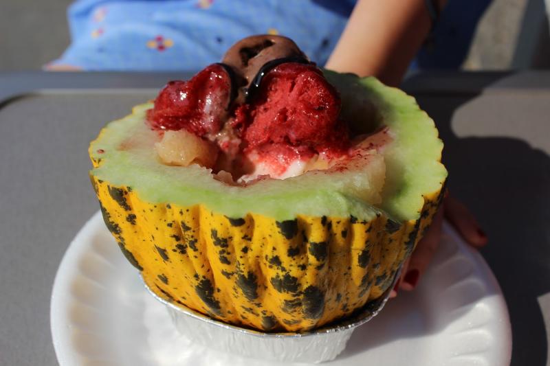Akşama doğru artık güneş etkisini yitirmişti. Biz de merkeze gidip otobüsten indiğimizde, soğuk kocaman kavun içine damla sakızlı dondurma koyarak ikram eden bir büfe gördük. İçimizde kavun içi dondurma kaldığı için siparişlerimizi verdik ve beklemeye başladık. Etrafı incelerken tesadüfen Tostçular Çarşı'sının önünde olduğunu fark ettik. Kavunlarımızı ve dondurmayı afiyetle yedikten sonra Tostçular Çarşısı'nda Mesut'ta Ayvalık Tostu yedik. Kanelo Çalık'a göre çok daha lezzetliydi, fiyatı da uygundu. Bence tostu kesinlikle Tostçular Çarşısı'nda yemelisiniz.