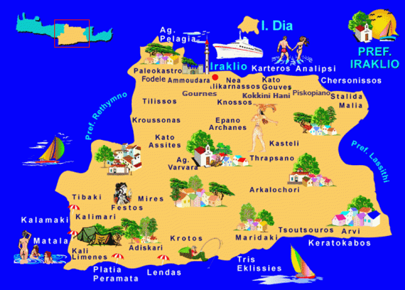 Girit’in başlıca şehirleri Heraklion (Kandiye), Retimnon (Resmo), Khania (Hanya) ve Ayos Nicolas.