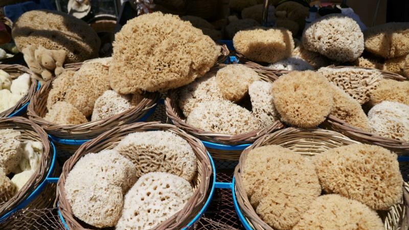 Sol tarafta demirlemiş yatlar ve balıkçı tekneleri yer alıyor. Bazı balıkçı tekneleri önünde adada oldukça yoğun olan, süngercilikle uğraşan kişileri çalışırken ve denizden çıkarttıkları süngerleri sergilerken görüyoruz.