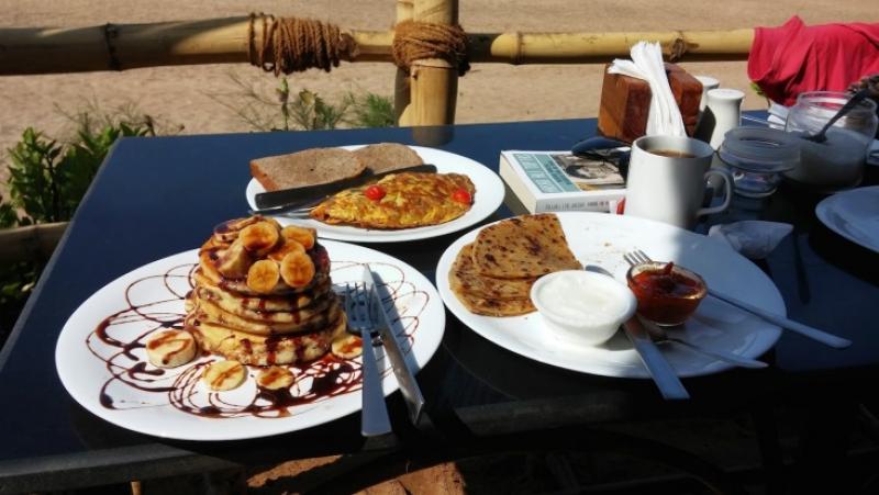 Aşağıdaki fotoğraf ise benim Agonda'daki tipik kahvaltı menüm. Sebzeli omlet, paratha (bizdeki patatesli gözleme ya da katmer benzeri bir şey), muzlu çikolatalı pancake ve çay. Garsona hepsini aynı anda getirmesini söylediğimde şaşkın bir bakış atmıştı bana. Ben de bunu anlayıp aynı zamanda hepsinden parça parça yemeyi sevdiğimi söylemiştim : )