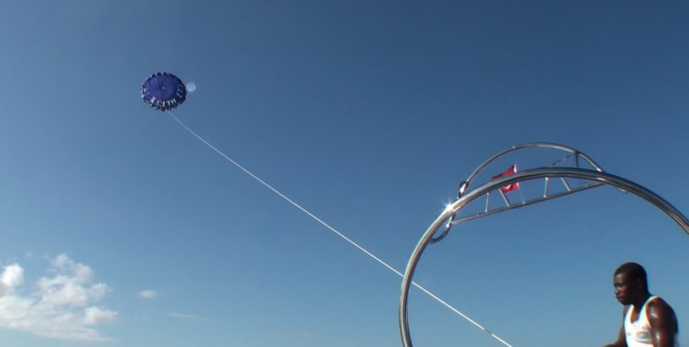 Ve vakit geldi. Bir elimle sıkıca tutunuyorum diğer elimde ise düşmemesi için kamerayı sıkıca kavrıyorum. “Ok, ok,…” sesleri arasında tekneden ayrılıyorum. O esnada durumuda kavramak için kamera kaydına falan basmayı erteledim. Ne zaman ki, tekne bir nokta olarak görünür oldu. Video kaydına başladım. Tepede rüzgar çok fazla hissediliyor. Biraz ürkütücü olsa da çok ama çok keyifli.