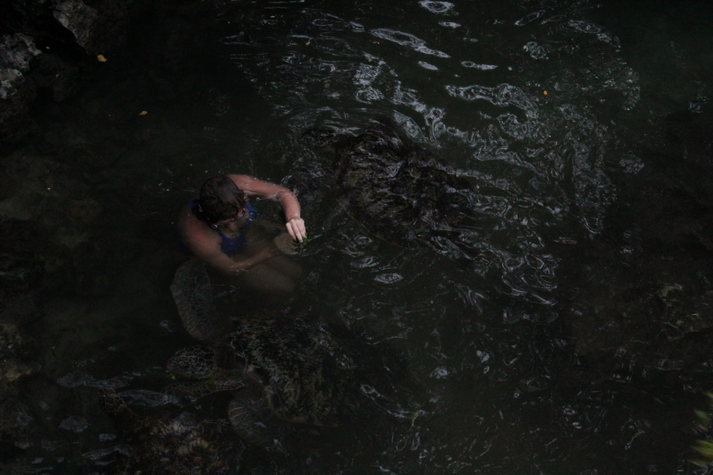 Vakit kaybetmemek için araçlarla yeniden otele döndük. Deniz yeniden yükselmişti. Ancak gün batımı öncesinde yapmamız gereken bir şey daha var. Nungwi bölgesinde iki tane doğal akvaryum bulunuyor. Bunlardan biri daha geniş ve içinde bulunan su kaplumbağalarını kenardan besleyebiliyorsunuz. Bir diğeri ise daha küçük, ama burada su kaplumbağaları ile birlikte yüzebiliyorsunuz. Tabii ki yüzmeyi tercih ettik. Kayaların arasındaki bu doğal havuzda kaplumbağalar ile yüzmek ve yüzerken onları beslemek ilginç bir deneyim.