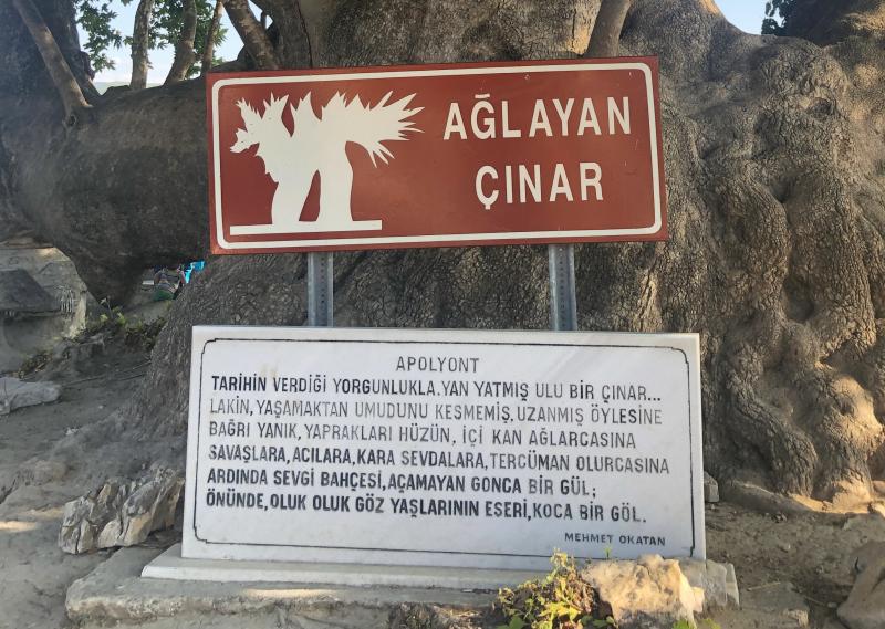Eski adıyla Apolyont olan bu köyde birbirine sevdalı 2 genç yaşarmış; Türk olan Mehmet ve Rum olan Eleni. Sürekli bu çınar ağacının oyuğunda buluşurlarmış. Ancak Kurtuluş Savaşı döneminde Rum köyleri boşaltılarak buralara Türkler yerleştirilmeye başlanmış. İşte tam da bu sırada Mehmet Eleni’nin abisini görmüş ve Eleni’yi aradığını söylemiş. Ama abileri Eleni’yi unutması gerektiğini, Eleni’nin çoktan yola çıktığını ve buraları terk ettiğini söylemişler. Ancak Mehmet direnmiş, eleni’yi görme konusunda ısrarını dile getirmiş ve sonunda abi ile kavgaya tutuşmuş. Eleni’nin abisi Yorgi de oracıkta Mehmet’i bıçaklamış. Bunu haber alan Eleni’nin arkadaşlarından biri haberi koşup Eleni’ye ulaştırmış. Eleni de konvoydan ayrılıp Mehmet’in yanına koşmuş. Ama bir bakmış ki Mehmet kanlar içinde ağacın oyuğunda yatıyor, çoktan ölmüş. Eleni de bu acıya dayanamayıp orada intihar etmiş. O zamandan beri de bu çınar “Ağlayan Çınar” olarak anılır olmuş.