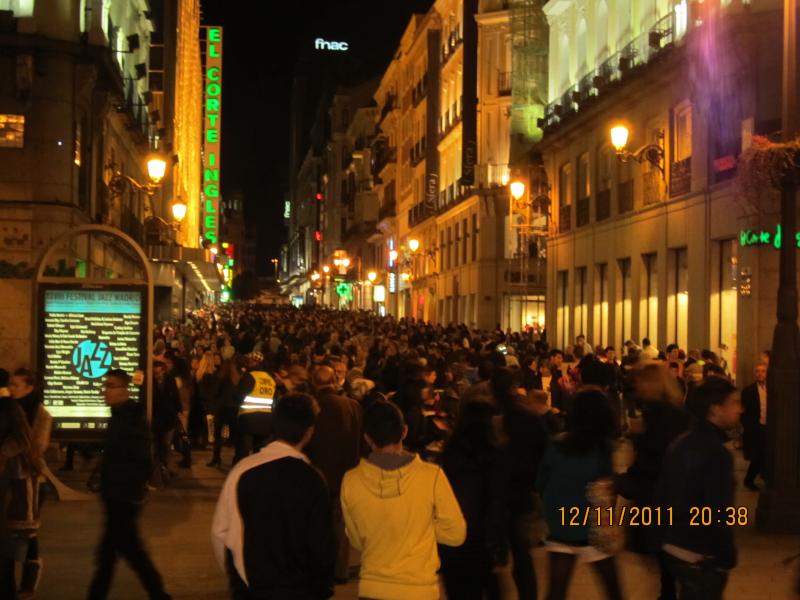 Otele dönmek üzere Puerto del Sol’de indiğimizde neye uğradığımızı şaşırıyoruz. Cumartesi olmasının etkisi ile zaten kalabalık olan meydan, hareket edilemez aşamaya gelmiş. Meydana açılan caddelere ise kalabalık değil, gürleyen insan seli demek daha uygun. Nereye gidiyor bu insanlar, nereden geliyor, ne yapacaklar, zaten bu kalabalıkta ne yapılabilir ki. İşin tuhafı, herkesin gayet mutlu ve keyifli görünüyor olması. İtişen kakışan yok, demek ki hep böyle ve insanlar burada her cumartesi günün bir karnaval gibi yaşıyorlar.