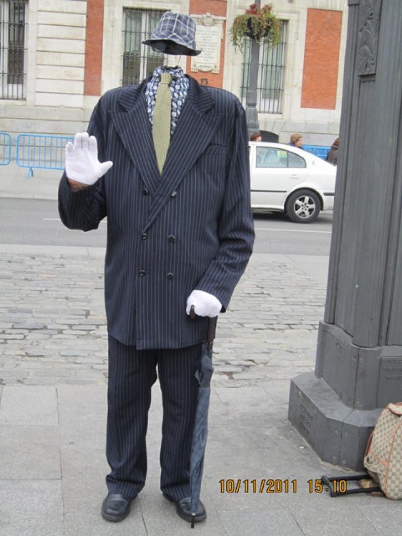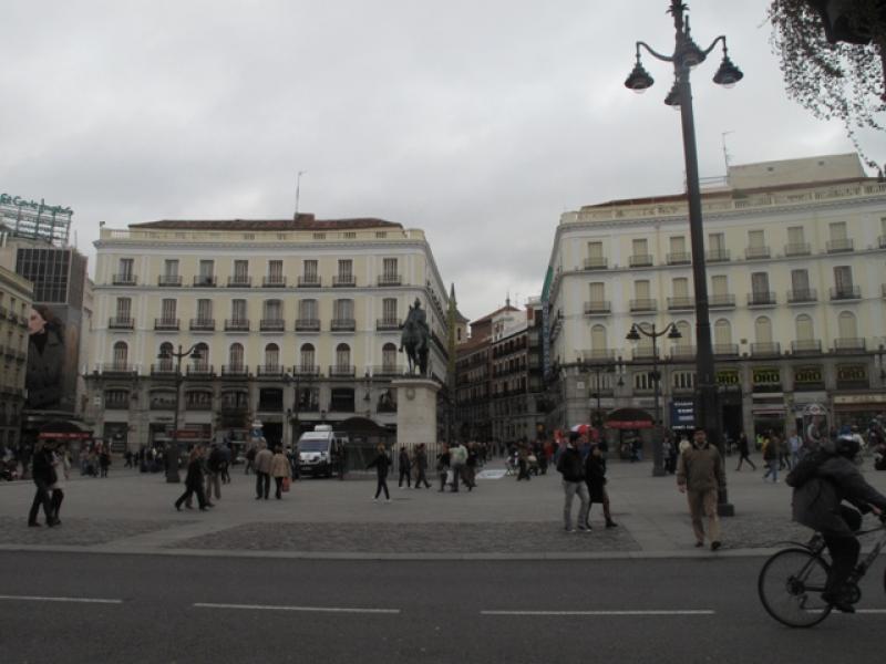 Otobüs ile belli başlı gezilebilecek noktaları gezip, bütün dünya oradaymış gibi görünen İspanya’nın hem ruhani, hem coğrafi merkezi haline gelmiş olan Puerta del Sol Meydanı’nda iniyoruz. Meydan, yapıları ya da formu ile ilgi çekici olmaktan öte anlamsız bir ifadesizliğe sahipken asıl ilgi çekici gelen, köşedeki Mallorquina adlı pastanenin camekânında sergiledikleri ve başsız adam, göbekli Spiderman gibi çeşitli kişiliklere bürünmüş sokak artistleri oluyor.