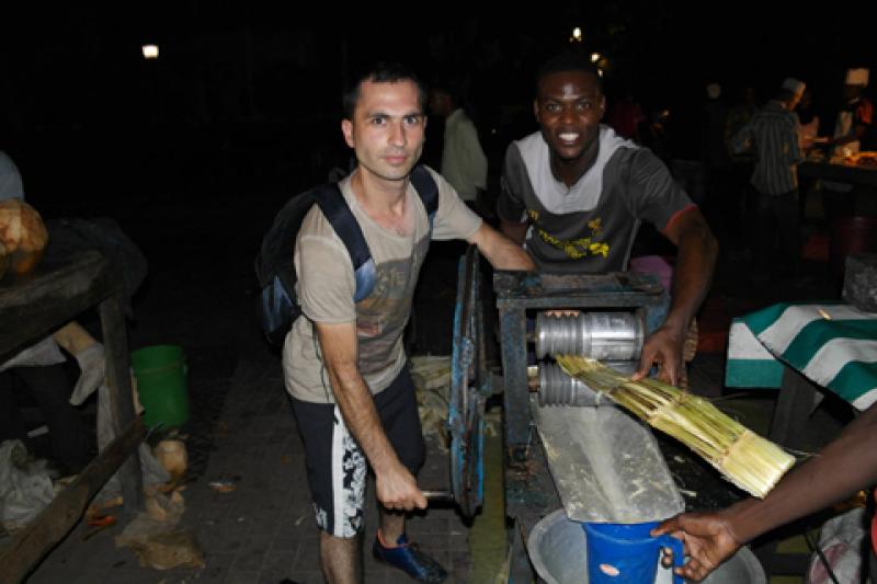 Aynı gün akşam hava karardıktan sonra Stone Town bölgesinin ünlü Forodhani Meydanı'nı gezdim. Bu meydanda her akşam pazar yeri kurluyor ve bu pazarın en önemli tezgahlarından biride hiç kuşkusuz şeker kamışı tezgahları. Ben de bu şeker kamışı tezgahlarından birinde kendi ellerimle sıktığım şeker kamışını afiyetle yudumladım.