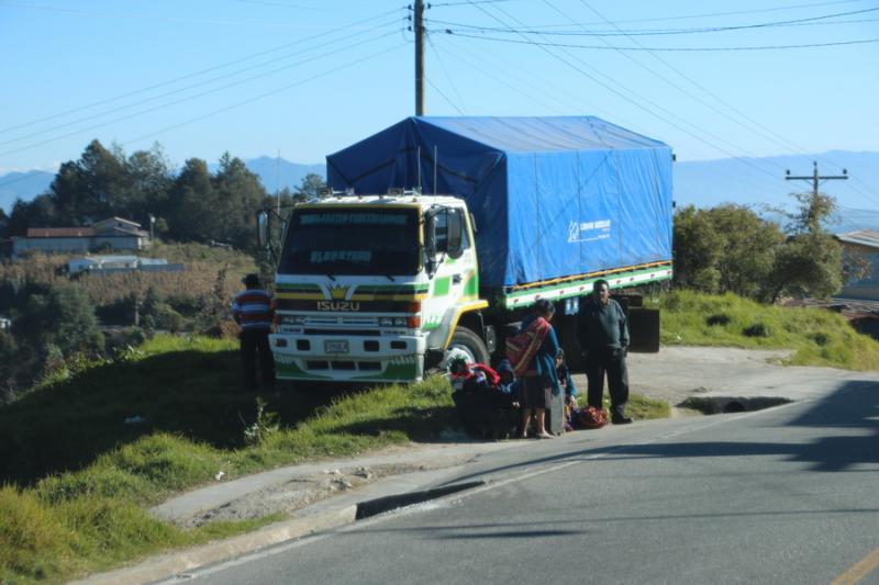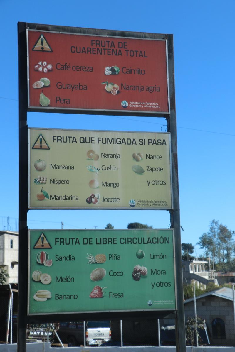 Arabaya bindikten yaklaşık bir saat kadar sonra Guatemala içinde eyalet değiştirdik. Guatemala eyaletlere ayrılmış. Eyalet değişikliği sırasında bir noktada durdurulduk. Yanımızda meyve olup olmadığını sordular. Yanımıza aldığımız meyveleri gösterdik. Bunların bir kısmının geçişine izin verdiler, bir kısmını ise alıkoydular. Bunun sebebi bazı meyvelerin içindeki organizmaların tarımı olumsuz yönde etkiliyor olması imiş. Bu yüzden eyalet girişine kocaman tabela koymuşlar. Şu şu şu meyvelerin girişi yasak. Şu şu şu meyvelerin girişi serbest diye...