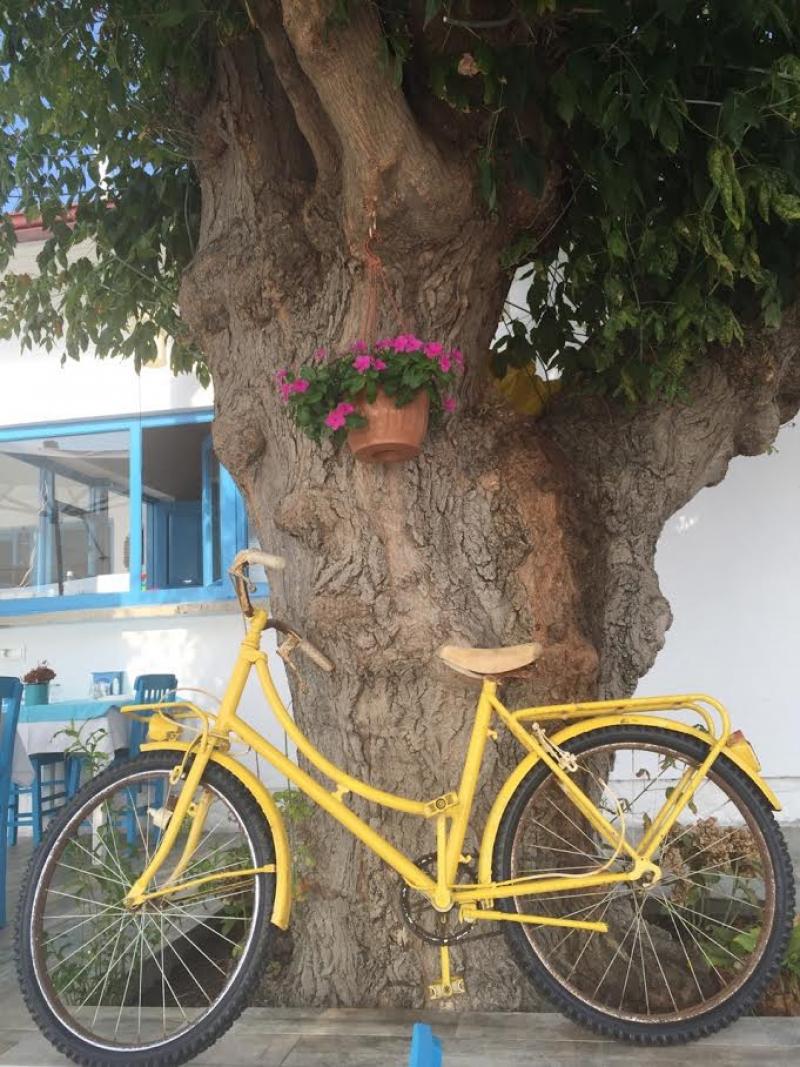 Bir insan nasıl düşünür, bisikleti sarıya boyayıp ağacın gövdesine yerleştirmeyi... Sonra o ağacı bir de saksı ile süslemeyi...Adanın her yerinde reklamı olan meşhur Efibadem Pastanesi'nin bademli kurabiyelerini çıkıyor karşınıza; tatlı severler buyursun.