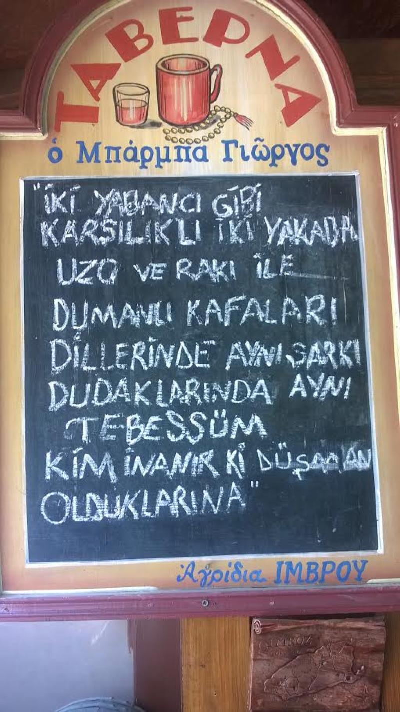 Tepeköy’de Yorgo’nun Yeri'nde yemek yemeden, zeytinyağının tadına bakmadan da dönülmez. Yunan cacığı ile çoban salata yan yana... Adada üretilmiş şaraplardan, zeytinyağı ve organik ada ürünlerinden alabilirsiniz buradan. Ben incecik üretilmiş katkısız ada zeytinyağı aldım. Ayrıca Yorgo’nun Yeri'nde Türk-Yunan dostluğu adına verilen mesajı okumadan geçmeyin: