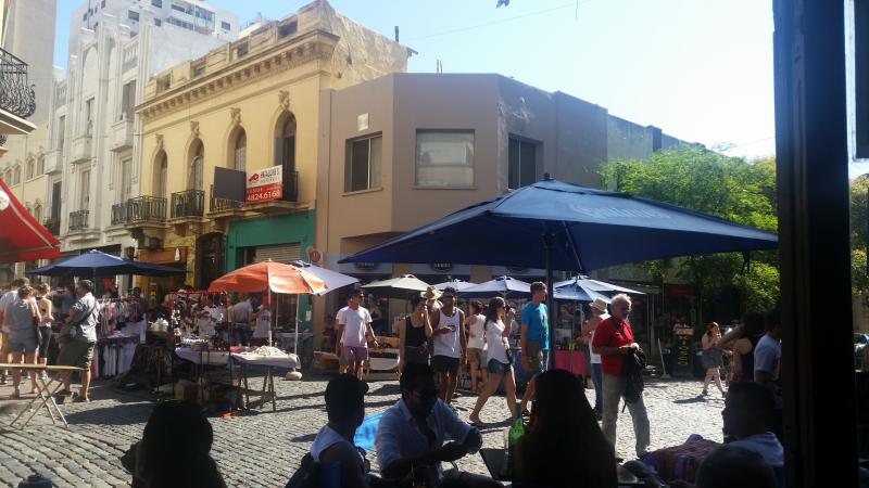 Lokantadan mutlu bir şekilde ayrılıyoruz ve birkaç adım sonra ünlü San Telmo semt pazarında buluyoruz kendimizi. Buradaki tezgâhlarda birbirinden güzel eski plaklardan, bohem tarzda aksesuar ve kıyafetlere, incik boncuktan hediyelik eşyalara ne ararsanız var. Her köşe başında farklı bir sokak sanatçısı grup gezinize keyifli müzikleriyle eşlik ediyor. Bir anda önünüze tango yapan tatlı bir çift de çıkabiliyor. Ne güzel yerler. Beyoğlu’nun arka sokaklarını anımsatıyor buradaki binalar… Hatıra olarak mate bardağı ve çayı alıyorum buradan. Unutmadan San Telmo’ya pazar günü gidin ki bu pazarı kaçırmayın. Pazar, Plaza Dorrego’da yer alıyor.