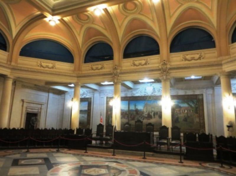 Duvarlarındaki kölelik zamanı resimleri ve tavan vitrayları zamanın meşhur sanatçıları tarafından resmedilmiş. Santos’un 1822-1933 yıllarını gösteren içerisinde 153 figürün bulunduğu bu çok güzel tablolar dikkatimizi çekiyor. Diğer bir salonda ise çeşitli kahvelerin içilerek denendiği ve satışının yapıldığı, eski kahve değirmeninin de bulunduğu bir kafe bulunuyor.