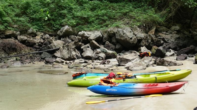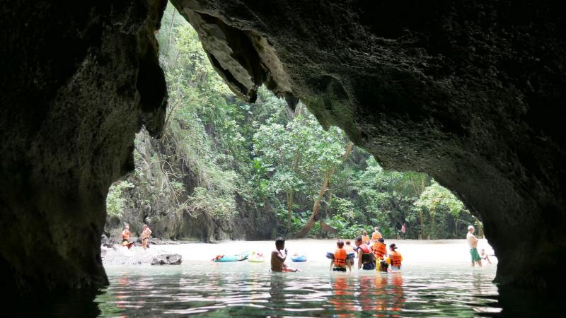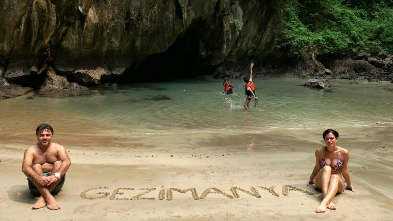 Evet, mağaranın başına geliyorsunuz, önde rehber herkes sıralanmış 80 metrelik mağaranın içinde yüzmeye başlıyorsunuz. Sonunda çıktığınız yer ise cennet olmalı. Suyun rengi zümrüt rengi olduğundan buraya Emerald Cave, yani zümrüt mağara demişler. Tay dilindeki adı ise Tham Morakot.