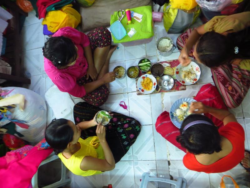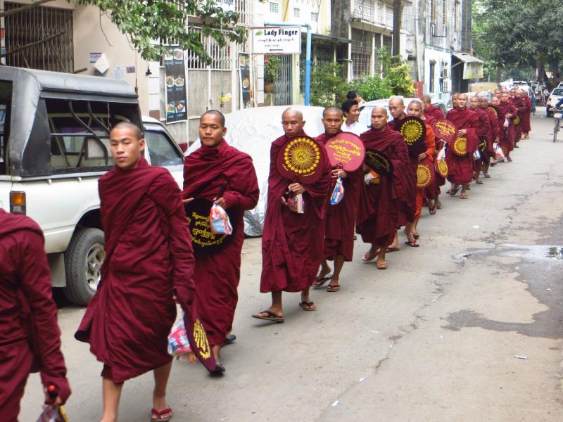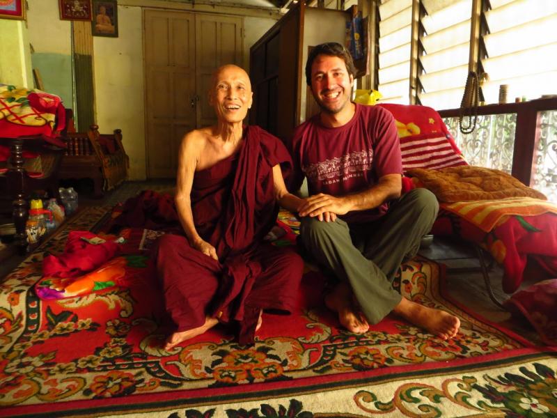 Yongon'daki bir başka durağım "Mya Thein Tam" budist manastırı oldu. Manastırdan içeri adım atar atmaz başrahip olduğunu öğrendiğim "Ukthra" ile göz göze geldim. Yere oturmuş karşısındaki birkaç kadınla sohbet ediyordu. Yanlarına davet ettiler. Kadınlardan birisi çat pat İngilizce biliyordu ve Ukthra ile sohbet etmeme yardımcı oldu. Güler yüzlü çok şeker ton ton bir adamdı. Ukthra, 88 yaşında ve bölgedeki 30'dan fazla manastırın da lideri. Bir süre sohbetin ardından akşam duasına davet edildim. Onlar da öğle yemeğine geçtiler. Ben de şöyle bir göz attım. Baş rahip ve öğretmen rahiplerin yemek sofralarına davet edildim ama teşekkür ettim, yemek yemiştim çünkü. Oldukça zengim sofraları dikkatimi çekti doğrusu.