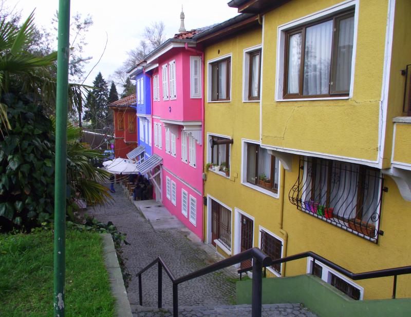 Yeşil Cami ve Yeşil Türbe'nin hemen çevresinde çok güzel turistik mekanlar bulunuyor. Kafeler, antika dükkanları, minik çayhaneler... Özellikle rengarenk boyalı evlerin olduğu pembe çiçekli ağaçların sarmaladığı bir sokakta bulduk kendimizi, gerçekten çok çok güzeldi.