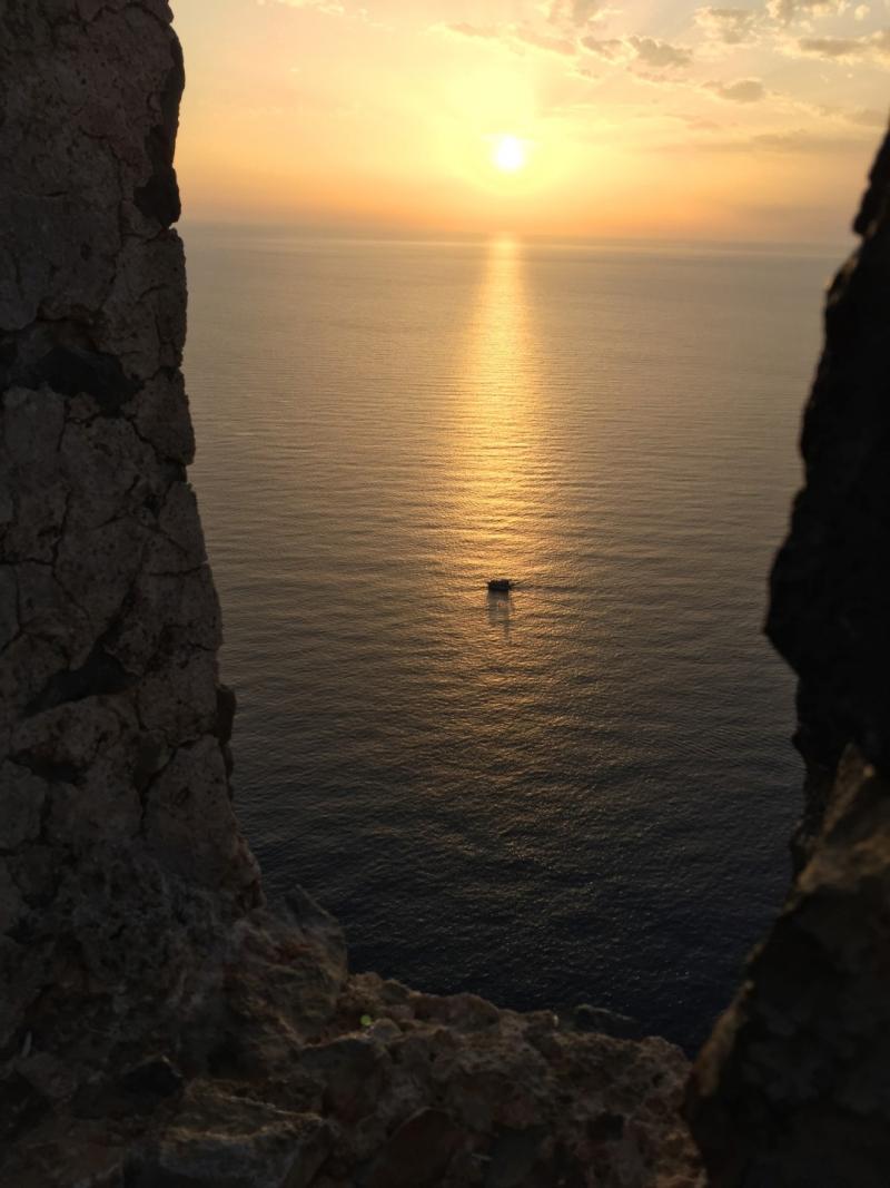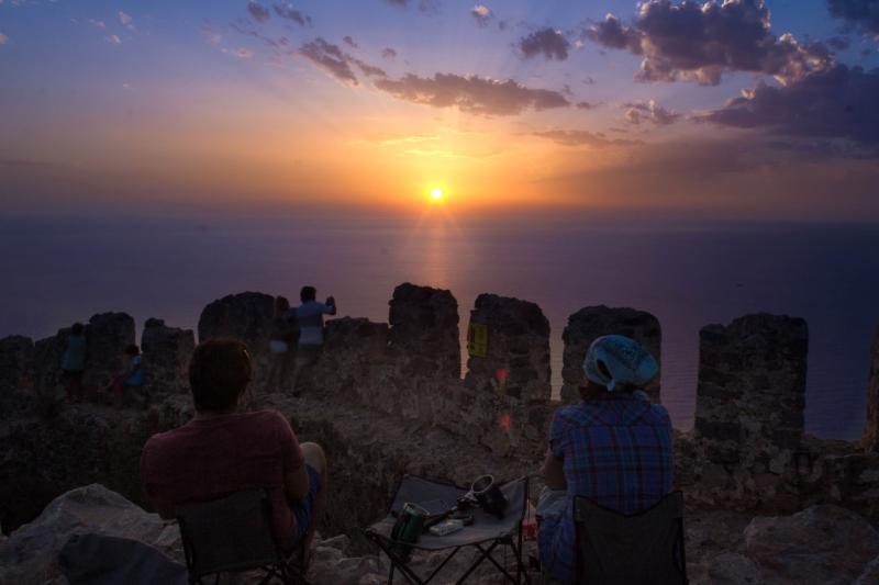 Gün bitmek üzereydi ve iyiden iyiye karnımız da acıkmıştı. Ama akşam üstü için güzel bir plan yapmıştık. Alanya'daysanız ve gün bitmeye yakınsa Alanya Kalesi'ne çıkmanızı tavsiye ederim. Gün batımının bu kadar güzel izlendiği yer çok azdır. Biz bu fırsatı kaçırır mıyız? Güneşin batışına karşı romantik bir akşam yemeği düzenledik kendi çapımızda. Ne ordövr tabağı, ne mezeler, ne de şaşalı bir menü; bir büyük boy pizza yeterliydi. Kamp sandalyelerimizi kurduk pizzamızı yerken ortamın tadını çıkardık.