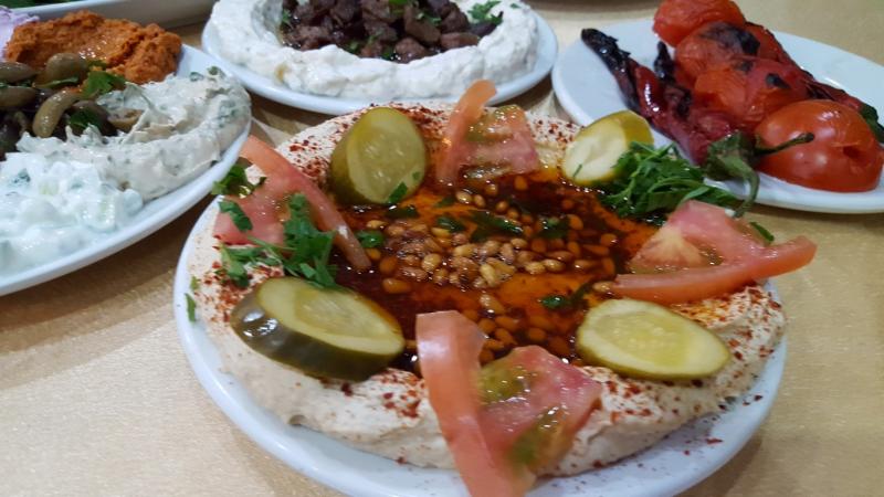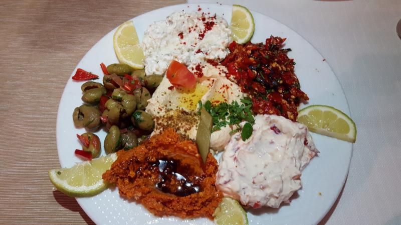 Hatay’daki son akşam yemeği için durak noktamız ise Kuzeytepe’deki Saray Restoran. Buraya gelmeden bizi uyarmışlardı sadece meze söyleyin diye, biz de aynen öyle yaptık. Enfes bir sofra donattık. Humus, tarator, prenses, muammara, cacık ve daha neler neler…