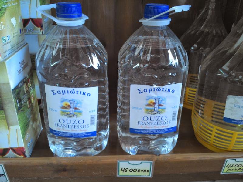 Gezerken aklıma geliyor; babama bir uzo alıyım diyorum. Sadece Frantzeskos adında ürünler satan bir mağazaya giriyoruz.
