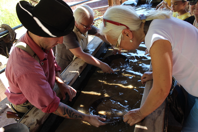 Ayrıca tahtadan yaptıkları uzunca bir yalak içine kum ve su koymuşlar. İçine minik minik gümüş parçaları atmışlar. 1 $ vererek kumların içinden gümüş çıkartıyorsunuz. Biz de diğer turistler gibi çıkarttığımız gümüş parçalarını poşetleterek hatıra olarak yanımıza alıyoruz.