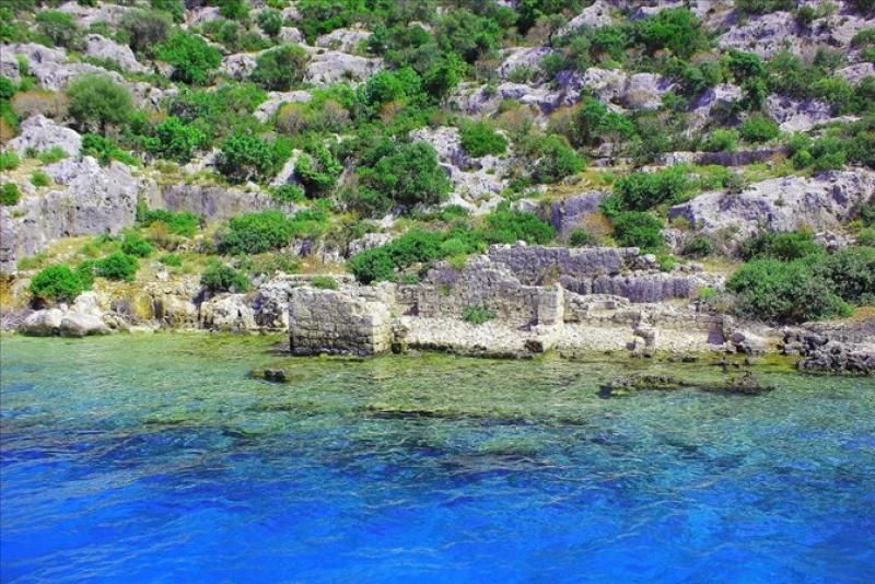 Üçüncü gün Üçağız’dan tekne ile yola çıktık. Bir özel yer daha olan Batık Şehir‘i gördük. Mimari öğeleri hala ayırt edilebilen bu yerleşim şu anda sular altında. Arkeolojik alan olması sebebiyle denize girmek yasak. Tekneyle geçerken önce kıyıdaki kırık dökük yapılar sizi karşılar. Suya doğru bakarsınız bu yapıların suyun altında da devam ettiği görülür. Sonrasında yolu olmayan bir köy olan Kale Köy önünden geçtik. Eski mezarlar hala görülür. Burada Koç ailesi ve Demirören ailesine ait evler var. Sonrasında Tersane Koyu, Esmeralda Koyu, Hamidiye Koyu‘na uğradık.