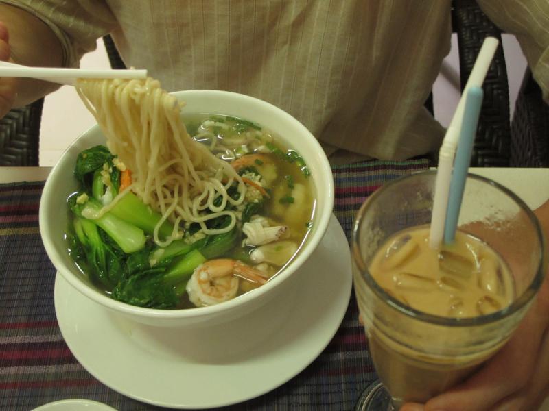 Tipik bir Asya kahvaltısı: kızarmış sebzeli pirinç, makarna çorbası ve buzlu tatlı kahve