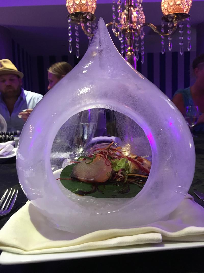 Özellikle Asiana adlı restoranda bizler için hazırlanan akşam yemeği ve sunum enfesti. İlk olarak buzdan yapılmış servis tabakları içerisinde sushi servis edildi.