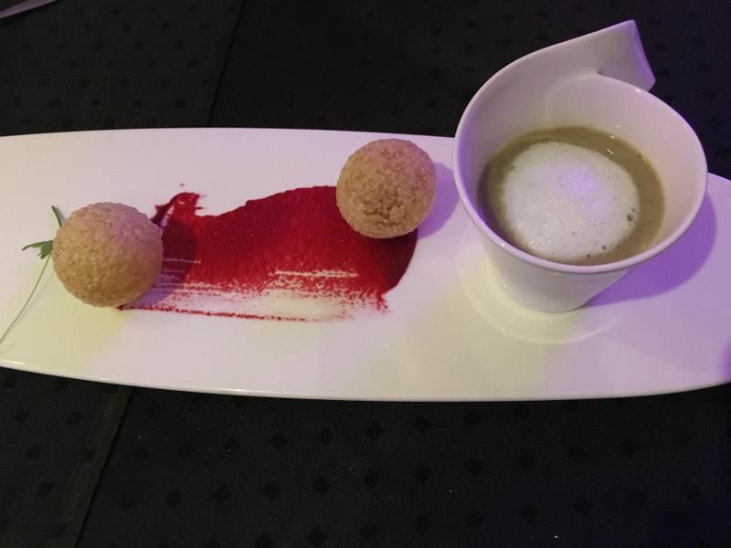 Ardından avokadolu çorba ve yanında çıtır deniz ürünleri keki, yanında da biraz ev yapımı marmelat.
