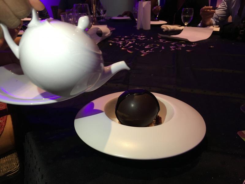 Tatlı olarak çikolata küresinin içinde çikolatalı mousse servis edildi.